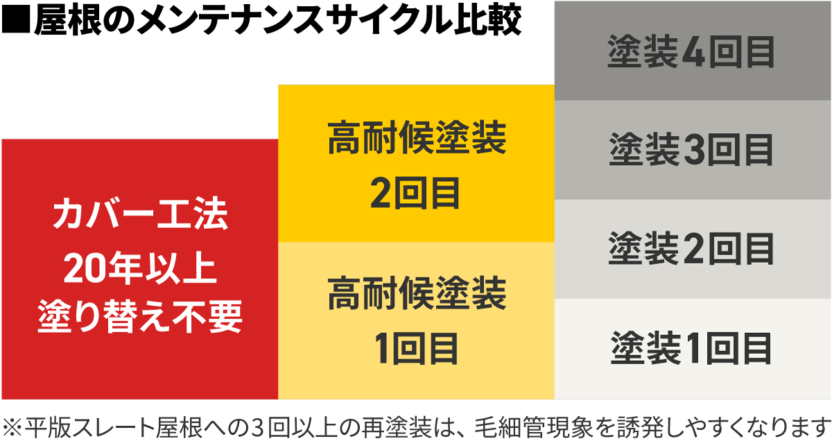 対して葺き替えの場合、スレート屋根なら屋根面積が100㎡で約1.3トンの廃材がでます。さらに、2004年以前に施工されたスレート屋根は、原材料にアスベストを含むことが多く、解体を困難にし、加えてその費用も高額になります。カバー工法なら、この解体・廃材処分費を大幅に削減することができるのです。